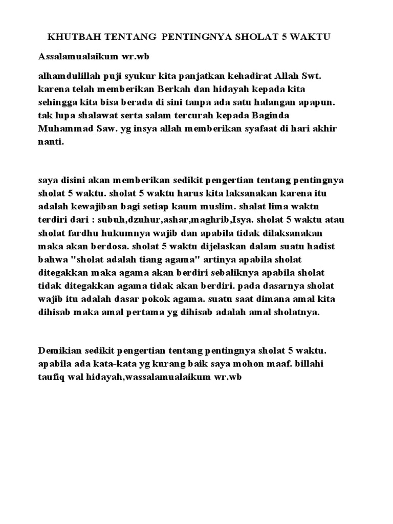 Dalam hal ini adalah sholat 5 waktu dalam sehari semalam, yaitu: Ba'da shalat subuh, 8 maret 2020 seperti biasa dkm al barkah menyelenggarakan pengajan minggu pagi. Keutamaan shalat1 shalat memiliki kedudukan yang sangat tinggi dalam islam. Dari keempat tiang ini, setelah syahadat, yang terpenting adalah shalat. Pentingnya mendirikan sholat ini telah disampaikan oleh allah swt. Oleh karena itu, rasulullah memberikan perhatian ekstra terhadap masalah shalat. Bahkan di dalam hadist rasulullah disebutkan bahwa sholat adalah tiangnya agama. Diantara pentingnya shalat dalam kehidupan adalah sebagai berikut: Dalam islam, ibadah ini punya kedudukan tinggi. Saya sendiri melihat kebelakang sudah banyak sekali waktu yang. Nah dari hadist diatas, menggambarkan bahwa pentingnya tuma'ninah, yang harus dilakukan dalam gerakan shalat, karena dapat mempengaruhi sahnya shalat. Pada dasarnya, shalat juga merupakan bentuk olahraga dan meningkatkan metabolisme seseorang, termasuk meningkatkan kesehatan kardiovaskular secara keseluruhan. Orang yang meninggalkan shalat karena membangkang tentang kewajiban shalat atau menyepelekannya, maka ia dihukumi kafir dan keluar dari islam, dalam hal ini, hakim wajib memerintahkannya untuk tobat, jika ia tobat dan mendirikan shalat, maka masalah selesai, jika.