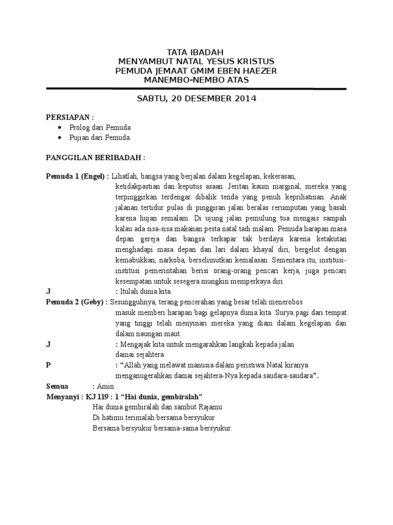 Perayaan natal pemuda jemaat bnkp yohanes i. Kita mulai kebaktian kita hari ini dengan keyakinan bahwa pertolongan kita adalah allah yang telah menjadikan langit dan bumi. Tata ibadah natal pemuda gkii : (2x) sungguh mulia, berkarunia hari natal yang kudus. Tata ibadah natal keluarga (wyk) 2;